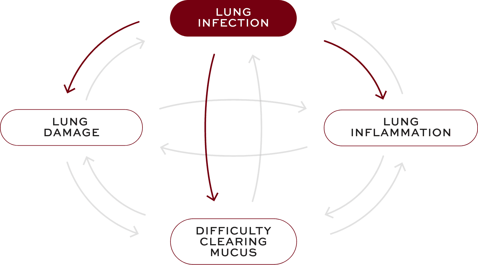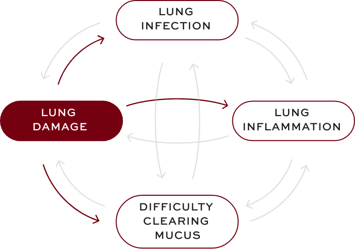 The main factors include inflammation, difficulty clearing mucus from the lungs, lung infection, and lung damage.
